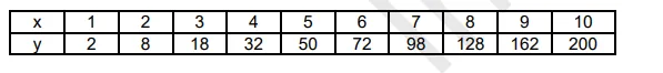 Draw a graph from the following data. Draw tangents at $x=2,4,6$ and 8 . Find the slopes of these tangents. Verify that the curve is drawn is $\mathrm{y}=2 \mathrm{x}^{2}$ and the slope of tangent is $\tan \theta=\frac{d y}{d x}=4 x$.