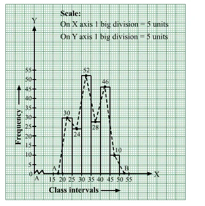 Also, we take the imagined classes 15–20 and 50–55, each with frequency 0. The class marks of these classes are 17.5 and 52.5, respectively.