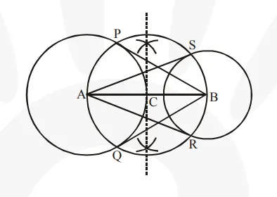 2. Bisect the line AB. Let the mid-point of AB be C. Taking C as centre, draw a circle of AC radius which will intersect the circles at points P, Q, R, and S. Join BP, BQ, AS, and AR. These are the required tangents.