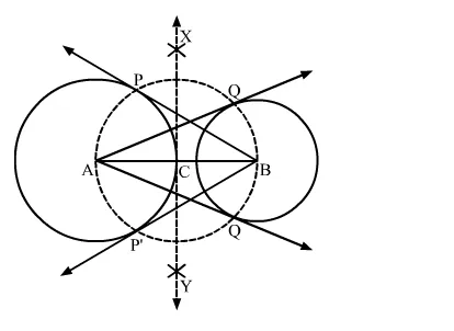 Here, AQ and AQ' are the tangents from A to the circle with centre B. Also, BP and BP' are the tangents from B to the circle with centre A.