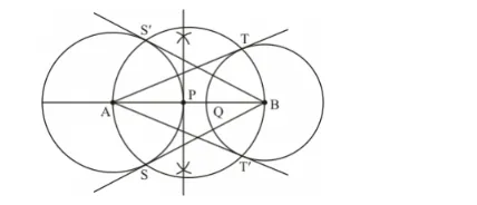 Draw a line segment AB of length 8 cm. Taking A as centre, draw a circle of radius 4 cm and taking B as centre, draw another circle of radius 3 cm. Construct tangents to each circle from the centre of the other circle.