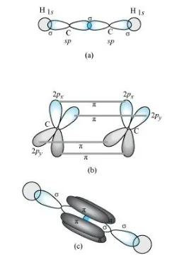 One sp orbital of each carbon atom overlaps with the other along the internuclear axis forming a C–C sigma bond. The second sp orbital of each C–atom overlaps a half-filled 1s-orbital to form a σ bond.