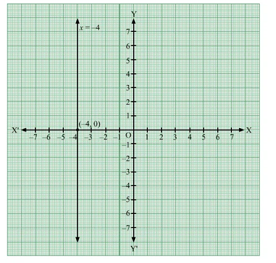 (ii) The equation of given line is x + 4 = 0 or x = –4. This equation does not contain the term of y. So, the graph of this line is parallel to y-axis passing through the point (–4, 0).