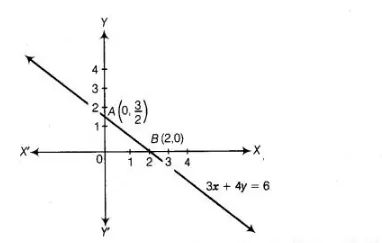Draw the graph of the linear equation 3x + 4y = 6. At what points, the graph cuts X and K-axes?
