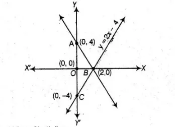 Draw the graph of the pair of equations 2x + y= 4 and 2x – y = 4. Write the vertices of the triangle formed by these lines and the y-axis, find the area of