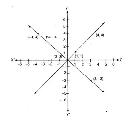 By plotting the points (3, – 3) and (- 4, 4) on the graph paper and joining them by a line, we obtain the graph of y = – x.