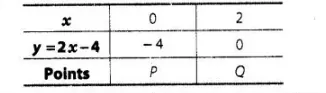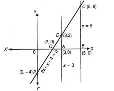 Draw the points $P(0,-4)$ and $Q(2,0)$ and join these points and form a line $P Q$ also draw the lines $x=3$ and $x=5$.