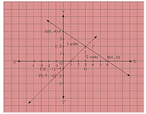 By the intersection of lines formed by 2x + 3y = 12 and x - y = 1 on the graph, triangle ABC is formed on y axis.