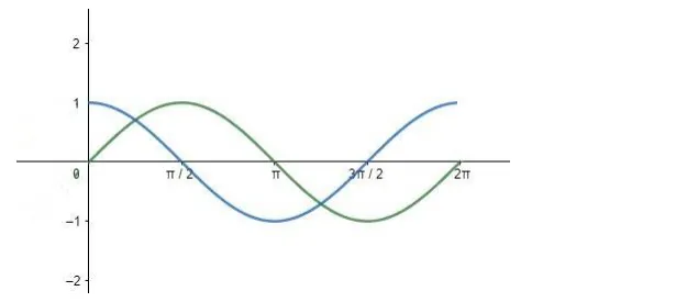 The green line represents curve for $\sin (x)$ and blue for $\cos (x)$ for $[0,2 \pi]$.