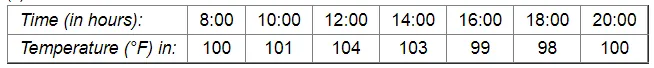 | Temperature (°F) in: | 100 | 101 | 104 | 102 | 100 | 99 | 100 | 98 |
