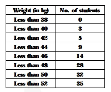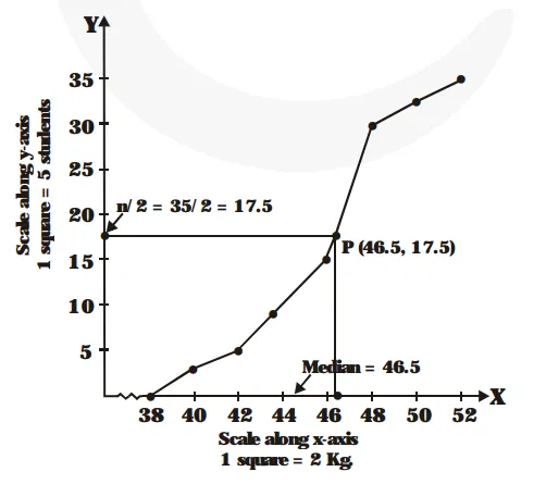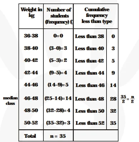 $=46+\left\{\frac{\frac{35}{2}-14}{\mathbf{1 4}}\right\} \times 2=46+\frac{\mathbf{1}}{\mathbf{2}}=46.5 \mathrm{~kg}$