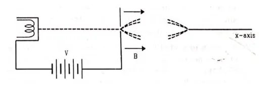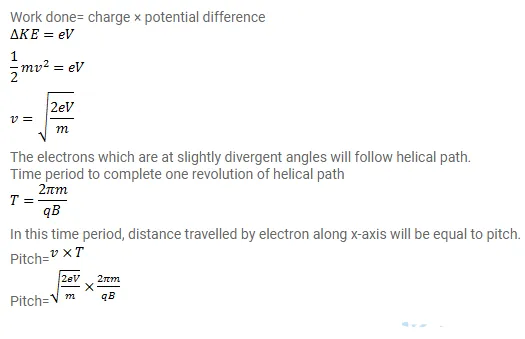 Electrons are emitted with negligible speed from an electron gun are accelerated through a potential difference $V$ along the $X$-axis. These electrons emerge from a narrow hole into a uniform magnetic field B directed along this axis. However, some of the electrons emerging from the hole make slightly divergent angles as shown in figure. Show that these paraxial electrons are focused on the $X$-axis at a distance