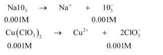 When equal volumes of sodium iodate and cupric chlorate solutions are mixed together, then the molar concentrations of both solutions are reduced to half i.e., 0.001 M.