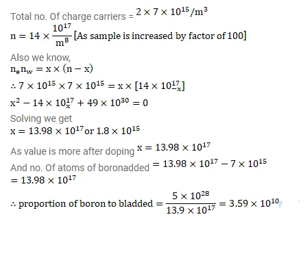 Estimate the proportion of boron impurity which will increase the conductivity of a pure silicon sample by a factor of $100 .$ Assume that each boron atom creates a hole and the concentration of holes in pure silicon at the same temperature is $7 \times 10^{16}$ holes per cubic metre. Density of silicon is $5 \times 10^{28}$ atoms per cubic metre.
