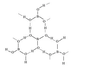 Boric acid has a layered structure. Each planar $\mathrm{BO}_{3}$ unit is linked to one another through $\mathrm{H}$ atoms. The $\mathrm{H}$ atoms form a covalent bond with a $\mathrm{BO}_{3}$ unit, while a hydrogen bond is formed with another $\mathrm{BO}_{3}$ unit. In the given figure, the dotted lines represent hydrogen bonds.