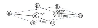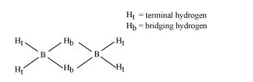 2 boron and 4 terminal hydrogen atoms $\left(H_{t}\right)$ lie in one plane, while the other two bridging hydrogen atoms $\left(H_{b}\right)$ lie in a plane perpendicular to the plane of boron atoms. Again, of the two bridging hydrogen atoms, one $\mathrm{H}$ atom lies above the plane and the other lies below the plane. The terminal bonds are reelentron ( $2 \mathrm{c}-2 \mathrm{e}^{-}$) bonds, while the two bridging (B-H-B) bonds are three-centre two-electron (3c - 2e^-) bonds.