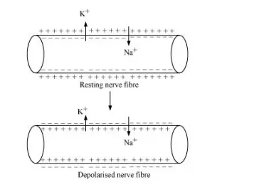 (a) Sodium ions play an important role in the generation of action potential. When a nerve fibre is stimulated, the membrane potential decreases. The membrane becomes more permeable to Na+ ions than to K+ ions. As a result, Na+ diffuses from the outside to the inside of the membrane. This causes the inside of the membrane to become positively-charged, while the outer membrane gains a negatively charge. This reversal of polarity across the membrane is known as depolarisation. The rapid inflow of Na+ ions causes the membrane potential to increase, thereby generating an action potential.