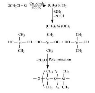 (a) When silicon reacts with methyl chloride in the presence of copper (catalyst) and at a temperature of about $537 \mathrm{~K}$, a class of organosilicon polymers called methylsubstituted chlorosilanes $\left(\mathrm{MeSiCl}_{3}, \mathrm{Me}_{2} \mathrm{SiCl}_{2}, \mathrm{Me}_{3} \mathrm{SiCl}\right.$, and $\mathrm{Me}_{4} \mathrm{Si}$ ) are formed.