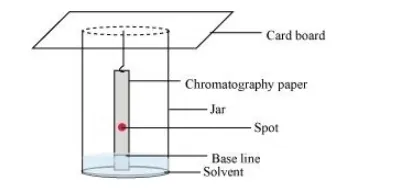 In paper chromatography, chromatography paper is used. This paper contains water trapped in it, which acts as the stationary phase. On the base of this chromatography paper, the solution of the mixture is spotted. The paper strip is then suspended in a suitable solvent, which acts as the mobile phase. This solvent rises up the chromatography paper by capillary action and in the procedure, it flows over the spot. The components are selectively retained on the paper (according to their differing partition in these two phases). The spots of different components travel with the mobile phase to different heights. The paper so obtained (shown in the given figure) is known as a chromatogram.