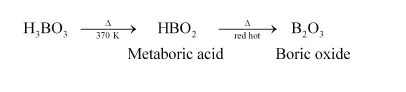 On heating orthoboric acid (H3BO3) at 370 K or above, it changes to metaboric acid (HBO2). On further heating, this yields boric oxide B2O3.