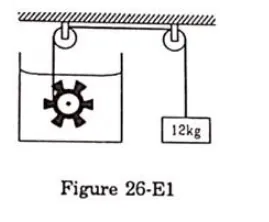 Figure (26.E1) shows a paddle wheel coupled to a mass of $12 \mathrm{~kg}$ through fixed frictionless pulleys. The paddle is immersed in a liquid of heat capacity $4200 \mathrm{~J} / \mathrm{K}$ kept in an adiabatic container. Consider a time interval in which the $12 \mathrm{~kg}$ block falls slowly through $70 \mathrm{~cm}$.