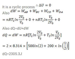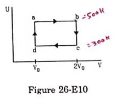 Figure (26-E10) shows the variation in the internal energy $U$ with the volume $\mathrm{V}$ of $2.0$ mole of an ideal gas in a cyclic process abcda. The temperature of the gas at $b$ and c are $500 \mathrm{k}$ and $300 \mathrm{k}$ respectively, Calculate the heat absorbed by the gas during the process.