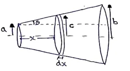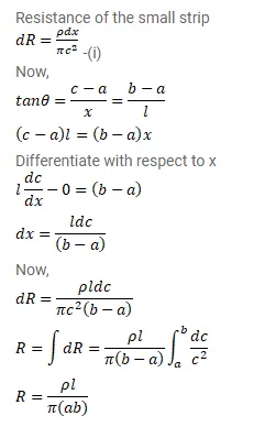 Figure (32-E1) shows a conductor of length I having a circular cross-section. The radius of cross-section varies linearly from a to $b$. the resistivity of the material is $\rho$. Assuming that $b-a<<$, find the resistance of the conductor.