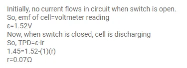 Figure (32-E2) shows an arrangement to measure the emf $\varepsilon$ and internal resistance r of battery. The voltmeter has a very high resistance and ammeter also has some resistance. The voltmeter reads $1.52 \mathrm{~V}$ when the switch $\mathrm{S}$ is open. When the switch is closed the voltmeter reading drops to $1.45 \mathrm{~V}$ and ammeter reads $1.0 \mathrm{~A}$. find the emf and internal resistance of the battery.