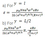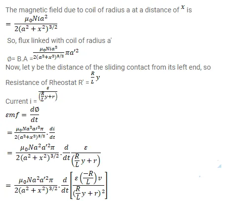 Figure shows a circular coil of $\mathrm{N}$ turns and radius a, connected to a battery of emf $\varepsilon$ through a rheostat. The rheostat has a total length $\mathrm{L}$ and resistance $\mathrm{R}$. The resistance of the coil is $\mathrm{r}$. A small circular loop of radius $a^{\prime}$ and resistance $r^{\prime}$ is placed coaxially with the coil. The centre of the loop is at a distance $x$ from the centre of the coil. In the beginning the sliding contact of the rheostat is at the left end and then onwards it is moved towards right at a constant speed v. Find the emf induced in the small circular loop at the instant