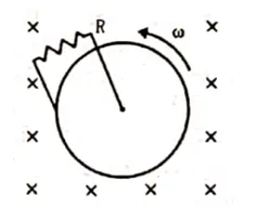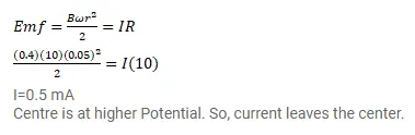 Figure shows a conducting disc rotating about its axis in a perpendicular magnetic field $B$. A resistor of resistance $R$ is connected between the center and the rim. Calculate the current in the resistor. Does it enter the disc or leave it at the center? The radius of the disc is $5.0 \mathrm{~cm}$, angular speed $\omega=10 \mathrm{rad} / \mathrm{s}, \mathrm{B}=0.40 \mathrm{~T}$ and $\mathrm{R}=10 \Omega$.