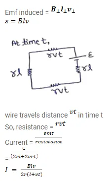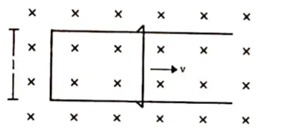 Figure shows a long U-shaped wire of length I placed in a perpendicular magnetic field B. A wire of length I is slid on the Ushaped wire with a constant velocity $v$ towards right. The resistance of all the wires is r per unit length. At $t=0$, the sliding wire is close to the left edge of the U-shaped wire. Draw an equivalent circuit diagram, showing the induced emf as a battery. Calculate the current in the circuit.