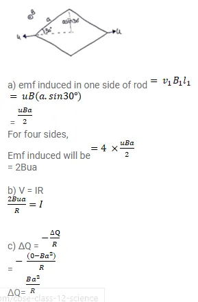 Figure shows a metallic square frame of edge a in a vertical plane. A uniform magnetic field B exists in the space in a direction perpendicular to the plane of the figure. Two boys pull the opposite corners of the square to deform it into a rhombus. They start pulling the corners at $\mathrm{t}=0$ and displace the corners at a uniform speed $u$.