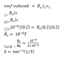 Figure shows a metallic wire of resistance $0.20 \Omega$ sliding on a horizontal, U-shaped metallic rail. The separation between the parallel arms is $20 \mathrm{~cm}$. An electric current of $2.0 \mu \mathrm{A}$ passes through the wire when it is slid at the rate of $20 \mathrm{~cm} / \mathrm{s}$. If the horizontal component of the earth's magnetic field is $3.0 \times 10^{-5} \mathrm{~T}$, calculate the dip at the place.