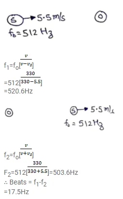 Figure shows a person standing somewhere in between two identical tuning forks. each vibrating at $512 \mathrm{~Hz}$. If both the tuning forks move towards right a speed of $5.5 \mathrm{~m} \mathrm{~s}^{-1}$, find the number of beats heard by the listener. Speed of sound in air = $330 \mathrm{~m} \mathrm{~s}^{-1}$.