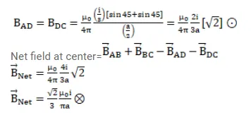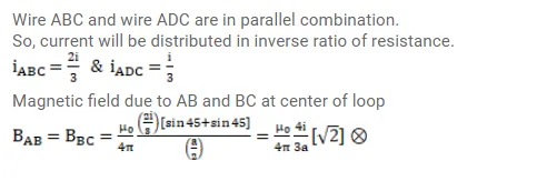 Figure shows a square loop $A B C D$ with edge length $a$. The resistance of the wire $A B C$ is $r$ and that of $A D C$ is $2 r$. Find the magnetic field $B$ at the center of the loop assuming uniform wires.