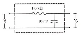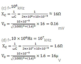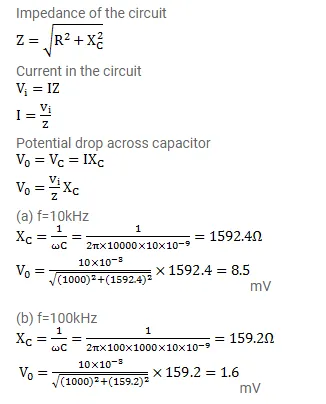 Figure shows a typical circuit for low pass filter. An AC input $\mathrm{v}_{\mathrm{i}}=10 \mathrm{mV}$ is applied at the left end and the output $\mathrm{v}_{0}$ is received at the right end. Find the output voltages for $\mathrm{v}=10 \mathrm{kHz}, 100 \mathrm{kHz}, 1.0 \mathrm{MHz}$ and $10.0 \mathrm{MHz}$. Note that as the frequency is increased the output decreases and hence the name low pass filter.