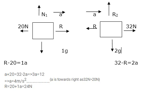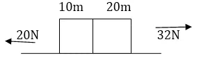 Figure shows a uniform rod of length $30 \mathrm{~cm}$ having a mass of $3.0 \mathrm{~kg}$. The strings shown in the figure are pulled by constant forces of $20 \mathrm{~N}$ and $32 \mathrm{~N}$. Find the force exerted by the $20 \mathrm{~cm}$ part of the rod on the $10 \mathrm{~cm}$ part. All the surfaces are smooth and the strings and the pulleys are light.