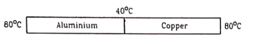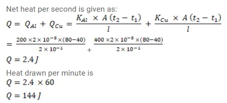 Figure shows an aluminium rod joined to a copper rod. Each of the rods has a length of $20 \mathrm{~cm}$ and area of cross - section $0.20 \mathrm{~cm}^{2}$. The junction is maintained at a constant temperature $40^{\circ} \mathrm{C}$ and the two ends are maintained at $80^{\circ} \mathrm{C}$ Calculate the amount of heat taken out from the cold junction in one minute after the steady state is reached. The conductivities are $K_{A l}=200 \mathrm{~W} / \mathrm{m}-{ }^{\circ} \mathrm{C}$ and $\mathrm{K}_{\mathrm{cu}}=400 \mathrm{~W} / \mathrm{m}-{ }^{\circ} \mathrm{C}$.