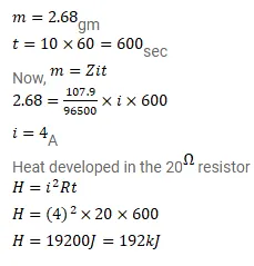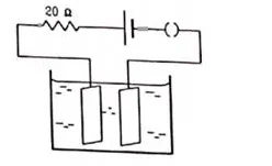 Figure shows an electrolyte of $\mathrm{AgCl}$ through which a current is passed. It is observed that $2.68 \mathrm{~g}$ of silver is deposited in 10 minutes on the cathode. Find the heat developed in the $20^{\Omega}$ resistor during this period. Atomic weight of silver is $107.9$ $\mathrm{g} /$ mole.
