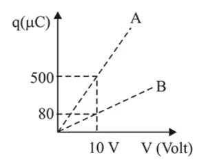 Figure shows charge (q) versus voltage (V) graph for series and parallel combination of two given capacitors. The capacitances are :
