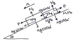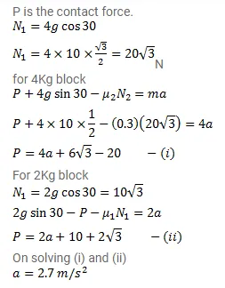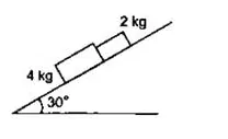 Figure shows two blocks in contact sliding down an inclined surface of inclination $30^{\circ}$. The friction coefficient between the block of mass $2.0 \mathrm{~kg}$ and theincline is $\mathrm{p}$ and that between the block of mass $4.0 \mathrm{~kg}$ and the incline is $\mu$. Calculate the acceleration of the $2.0 \mathrm{~kg}$ block if $(\mathrm{a}) \mu 1=0.20$ and $\mu 2=0.30$, (b) $\mu 1=0.30$ and $\mu 2=0.20$. Take $g=10 \mathrm{~m} / \mathrm{s}^{2}$.