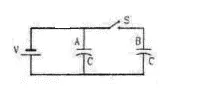 Figure shows two identical parallel plate capacitors connected to a battery through a switch S. Initially, the switch is closed so that the capacitors are completely charged. The switch is now opened and the free space between the plates of the capacitors is filled with a dielectric of dielectric constant 3 . Find the ratio of the initial total energy stored in the capacitors to the final total energy stored.
