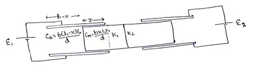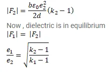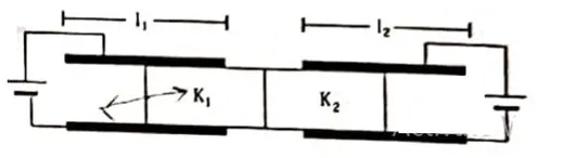 Figure shows two parallel plate capacitors with fixed plates and connected to two batteries. The separation between the plates is the same for the two capacitors. The plates are rectangular in shape with width $\mathrm{b}$ and length $\mathrm{I}_{1}$ and $\mathrm{I}_{2}$. The left half of the dielectric slab has a dielectric constant $\mathrm{K}_{1}$ and the right half $\mathrm{K}_{2}$. Neglecting any friction, find the ratio of the emf of the left battery to that of the right battery for which the dielectric slab may remain in equilibrium.