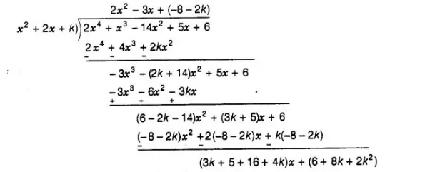 Given that, x2 + 2x+ k is a factor of 2x4 + x3 -14x2 + 5x+ 6, then we apply division algorithm,