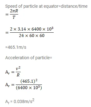 Find the acceleration of a particle placed on the surface of the earth at the equator due to earth's rotation. The diameter of earth $=12800 \mathrm{~km}$ and it takes 24 hours for the earth to complete one revolution about its axis.