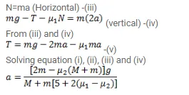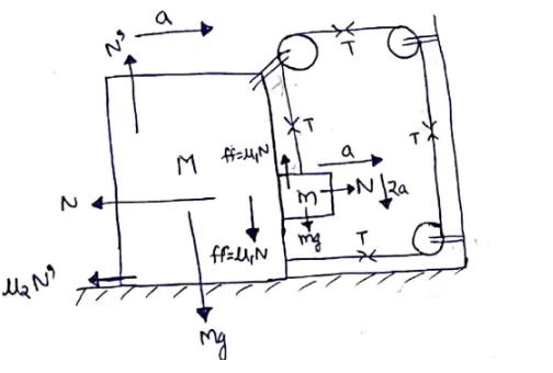Find the acceleration of the block of mass $M$ in the situation of figure. The coeffiicient of friction between the two blocks is $\mu 1$, and that between the bigger block and the ground is $\mu 2$.