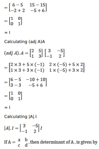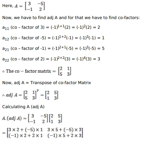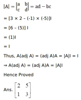 Find the adjoint of the given matrix and verify in each case that $A .(\operatorname{adj} A)=(\operatorname{adj} A)=m|A| \cdot I .\left[\begin{array}{cc}3 & -5 \\ -1 & 2\end{array}\right]$