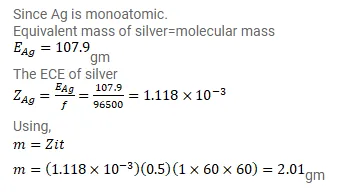 Find the amount of silver liberated at cathode if $0.500 \mathrm{~A}$ of current is passed through $\mathrm{Ag}^{\mathrm{NO}_{3}}$ electrolyte for 1 hour. Atomic weight of silver is $107.9 \mathrm{~g} / \mathrm{mole}$.