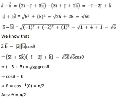 Find the angle between $(\overrightarrow{\mathrm{a}}+\overrightarrow{\mathrm{b}})$ and $(\overrightarrow{\mathrm{a}}-\overrightarrow{\mathrm{b}})$, if $\overrightarrow{\mathrm{a}}=(2 \hat{\mathrm{i}}-\hat{\mathrm{j}}+3 \hat{\mathrm{k}})$ and $\overrightarrow{\mathrm{b}}=(3 \hat{\mathrm{i}}+\hat{\mathrm{j}}+2 \hat{\mathrm{k}})$.