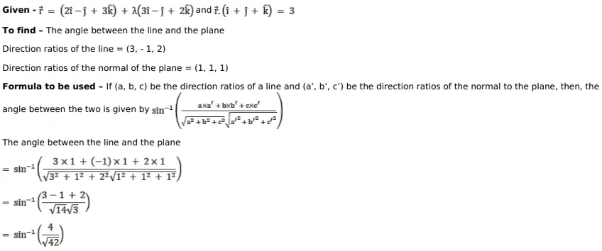 Find the angle between the line $\overrightarrow{\mathrm{r}}=(2 \hat{\mathrm{i}}-\hat{\mathrm{j}}+3 \hat{\mathrm{k}})+\lambda(3 \hat{\mathrm{i}}-\hat{\mathrm{j}}+2 \hat{\mathrm{k}})$ and the plane $\overrightarrow{\mathrm{r}} \cdot(\hat{\mathrm{i}}+\hat{\mathrm{j}}+\hat{\mathrm{k}})=3$.